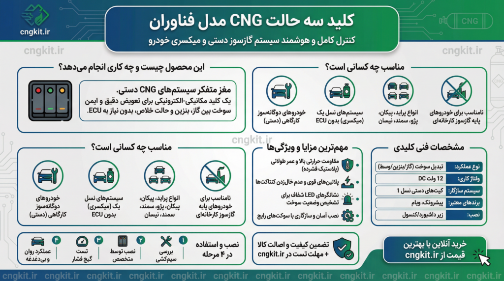 کلید سه حالت مدل فناوران دقیقاً برای رفع این مشکلات در سیستمهای ساده و نسل یک (بدون ECU) طراحی شده است. با نصب این قطعه، کنترل کاملی بر روی نوع سوخت مصرفی خودرو دارد و از شر قطع و وصلهای مکر خلاص میشوید.